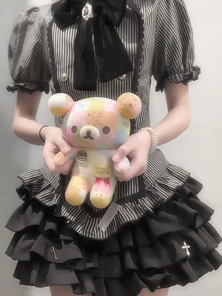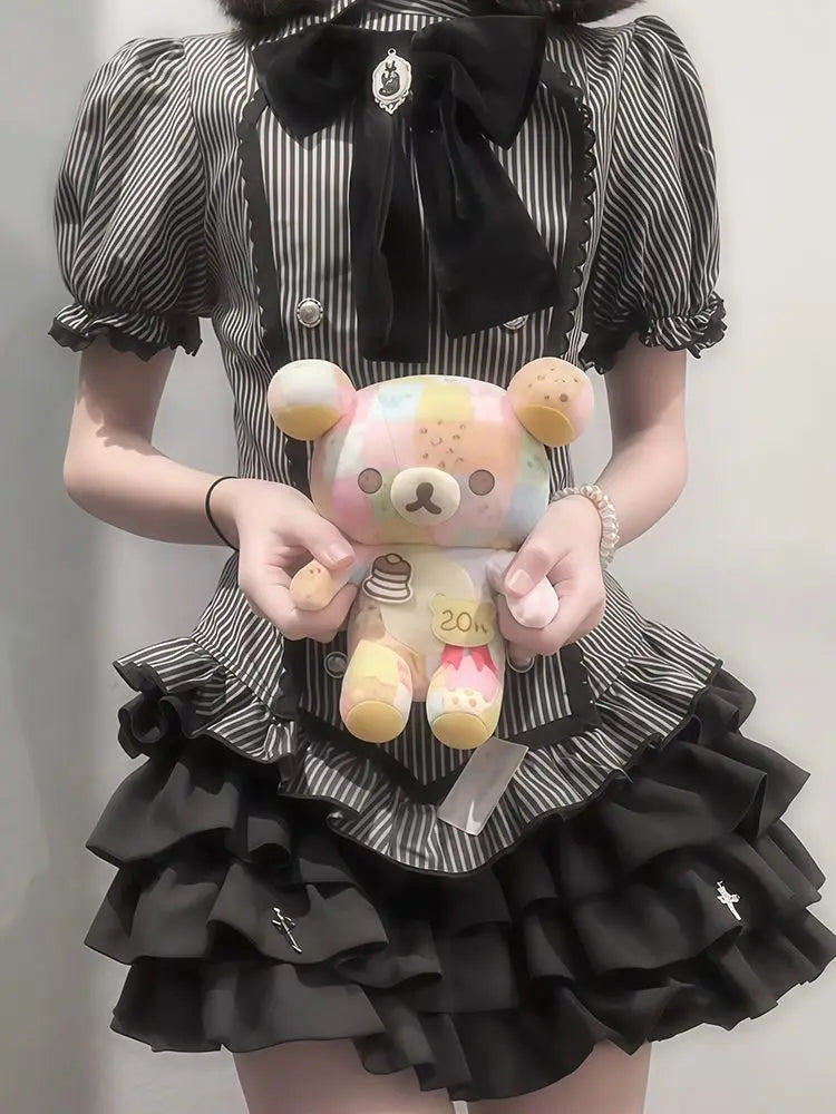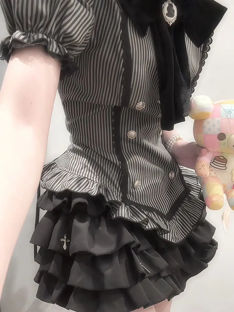 Japanese Harajuku Yami Kawaii 2 Piece Set Women's Short Sleeve Striped T Shirt + Mini Tiered Skirt Y2K Subculture Jirai Kei Set